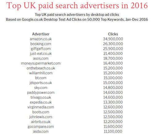 根据谷歌英国站电脑端50000个高频搜索关键词的文本广告点击量,AdGooroo排列出2016年英国前20名付费搜索广告主。排名显示,亚马逊生成近3500万个点击量,比排名第二的广告主多出850万。