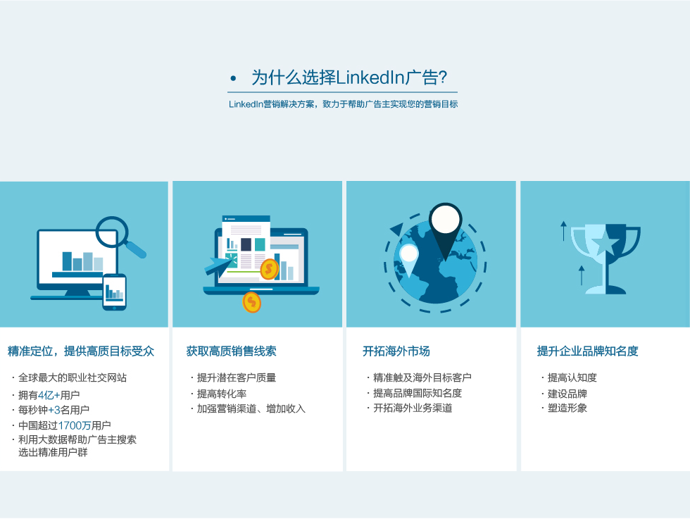 lnkedIn是全球最大的职业社交网站,覆盖全球200多个国家,拥有23种语言版本,用户主要为中高端的职场人士,可以对用户的地区、行业、职位头衔、教育程度等进行精准定位。同时,领英是为数不多的可以在大陆境内直接打开的广告流量平台。